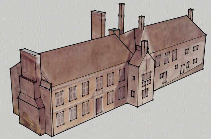 I've suggested the fourth part of the house referred to above to account for the chimneys visible in Buckler's painting. At the rear of the building in the watercolour can be seen a row of three apparently closely placed chimneys. One of these is on the right hand end of the nearer half of the building, one of the four chimneys standing at the ends of the two halves. This leaves two chimney stacks to account for, and I suspect that these stood alongside a rearward extension to the older half of the house, possibly serving a kitchen and associated rooms. The artist Buckler was also an architect, and given the very precise perspective used in the painting - and indeed in all his set of paintings of Wiltshire churches and notable other buildings - it seems reasonable to assume that he has been accurate in his portrayal. A speculative outline and position has been arrived at, using 3D modelling, for this rear part of the house, to make better sense of the presence of these two chimneys, although other configurations would doubtless fit the evidence. The 3D analysis suggests that these chimneys must have been positioned very close to the back wall of the main building, as otherwise their height would have been excessive.