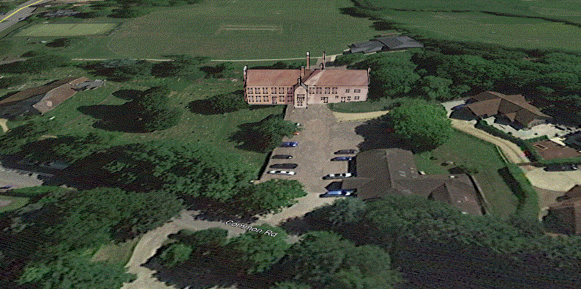 The two views below show this model dropped into the modern landscape across the churchyard and Memorial Hall car park, firstly viewed from above the church and secondly from above the car park entrance by the surgery.
