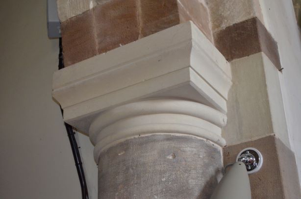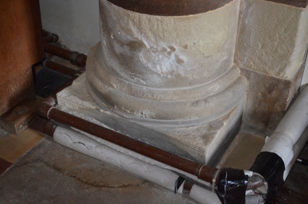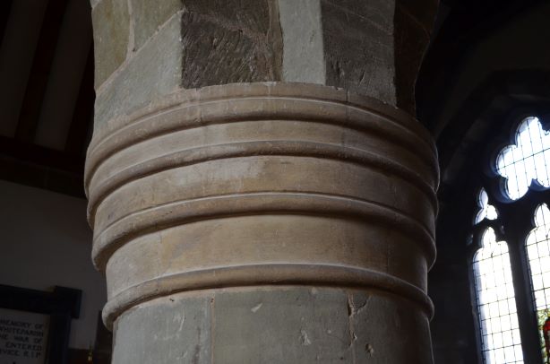 I have come across no suggestion of how these stones came to be there. It could be that there was an earlier stone building on the site, possibly to the same plan given the presence of captitals that could be reused. The stones in the west wall are more general and could have come from earlier arches in the chancel, had that been an earlier building in its own right. There has been much rebuilding of sections of the chancel.