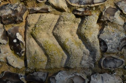 The northwest corner of the chancel features alternate light and dark stones as found in the chancel arch, although whether these are of the same or different dates is not clear. Interestingly the large stones of the chancel arch are lined above with dark stones on the east side like the north chancel wall features, but the west (nave) side has these small stones in alternating dark and light to match the arch itself. The south wall of the chancel appears the least sound, with a corner buttress and irregular surface, but it is all rendered, making it more difficult to reach any conclusions on age from the outside. All the parts of the church reconstructed by Butterfield in 1870 feature a characteristic chequered pattern of light and dark stone interspersed with flint panels. Finally there are mentions in some references to chalk used within the structure and of some brick sections of wall: there's a section of brickwork on top of the west wall inside the tower, for instance, covered by shingles on the outside.