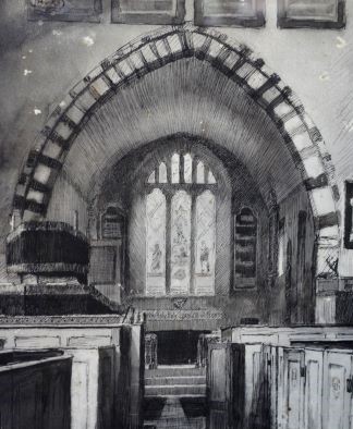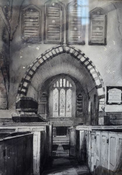 A black and white drawing of the chancel from the centre of the nave, with box pews