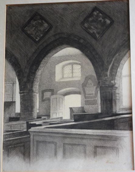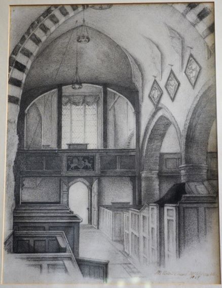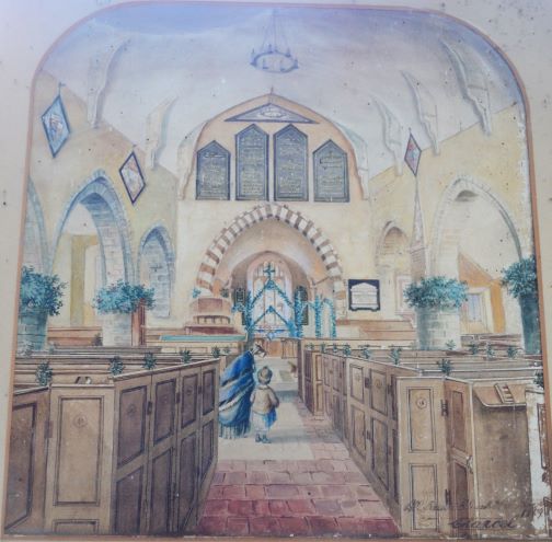 An extract from the 1869 watercolour showing the front of the west gallery at the back of the church. The charity boards from the front of the gallery are now displayed in the roof of the north porch. Frames were added after removal from the gallery, and the original headings of Charities and Donations are now covered by those frames, both now headed Charities