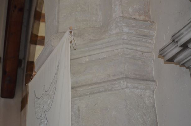 The north arcade has one pier with a tall moulded capital and two piers with short moulded capitals, almost like imposts in their position and form. The arches are plain. [crsbi but no specific date given]