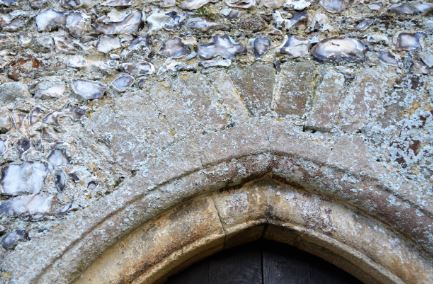 The church features a range of building materials. I've followed earlier writers in describing the dark ironstone as "heathstone" and the pillars as "greensand". There is also a pale stone that has been described as Chilmark stone. The older parts of the building in the chancel and the east and west walls of the nave are principally of flint, clearly a local material from the chalk within the parish, interspersed with occasional dark and light stones, at least four of which are reused sculpture in the west wall. There are a few bricks and even one or two tiles within the structure, notably in the base of the northeast corner of the north wall of the chancel. Corners and arches are constructed from heathstone in what appears to be the most altered section of the chancel on the north wall, and it is probable that many of the randomly placed dark stones in the north chancel wall came from the parts of these features that have since been rebuilt.
