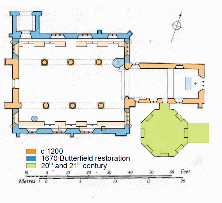 The plan below shows the basic structure of the church in the two key periods of its existence, neglecting for these purposes the possibility of the chancel being older. In the first stage (orange), the chancel and nave with both aisles stood from around 1200 until restoration by William Butterfield in 1870. As the blue part of the plan shows, he completely rebuilt the outer aisle walls, widening the aisles (but sparing the east and west walls of the nave). Apart from the 1969 addition of the octagonal vestry and its more recent toilet extension the chancel and nave of around 1200 and the Butterfield aisles of 1870 are still what we see today. To maintain clarity, this outline of the church's history omits lots of changes small and large over the intervening centuries: all of these are described in detail below.