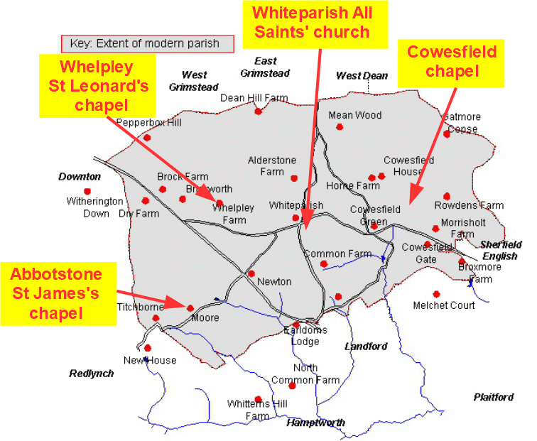 The very name Whiteparish brings interesting questions of its own. Alderstone, Frustfield (Abbotstone and Whelpley) and Cowesfield were all in Frustfield Hundred, which essentially consisted of all of the present parish plus an outlying area to the south of Earldoms that ran westwards from Wicketts Green Farm on the A36 south of the Common Road junction. The inclusion of the word "parish" in the name shows clearly that by this date the tithings of Abbotstone, Whelpley, Alderstone and Cowesfield had all been incorporated into one ecclesiastical parish and that the chapels of Abbotstone, Whelpley and Cowesfield were chapels of ease. This is reflected in the appointment of clergy from our earliest records - clearly recorded as rectors and vicars at Whiteparish but chaplains at the three chapels. In a wider context, the system of ecclesiastical parishes had started to appear in around 900 and had been extended to most of the country by the end of the twelfth century, and presumably this ecclesiastical process had selected Alderstone tithing to have the parish church. By then the ecclesiastical parish was used instead of the manor for taxation purposes [see for instance A History of the English Parish, N.J.G. Pounds, Cambridge University Press, 2004 (I have a local copy)].
