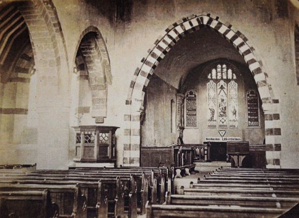 The church interior looking east into the chancel. The pews in the nave are the ones we have today, but the box pews in the chancel remain. Taken after Butterfield's restoration of 1870. This view shows the 10 Commandments boards still on the east chancel wall, so they must have been moved to their present position on the west chancel wall at a later date.