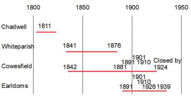 The 1881 1:10,560 OS map records Whiteparish Brick Field and Cowesfield Brickkiln. This is reinforced by the 1876 1:2500 map showing Whiteparish and the 1896 map at the same scale showing Cowesfield. Chadwell is no longer shown, and Earldoms still woodlands.