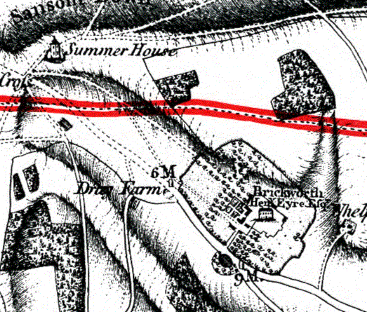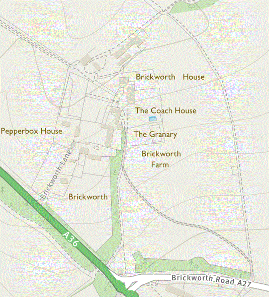 Two lodges marked the approach to Brickworth House, and both are still there. The first is prominent at Brickworth Corner and situated to the right of centre of the bottom edge of this map. The other was on a drive that led from above the Brickworth chalk quarry (now landfill) near the top of Pepperbox Hill directly across Brickworth Down to the house; this can be seen at the top left corner of the map. This lodge is now the farmhouse for Brock Farm: see Brock Farm for more details.