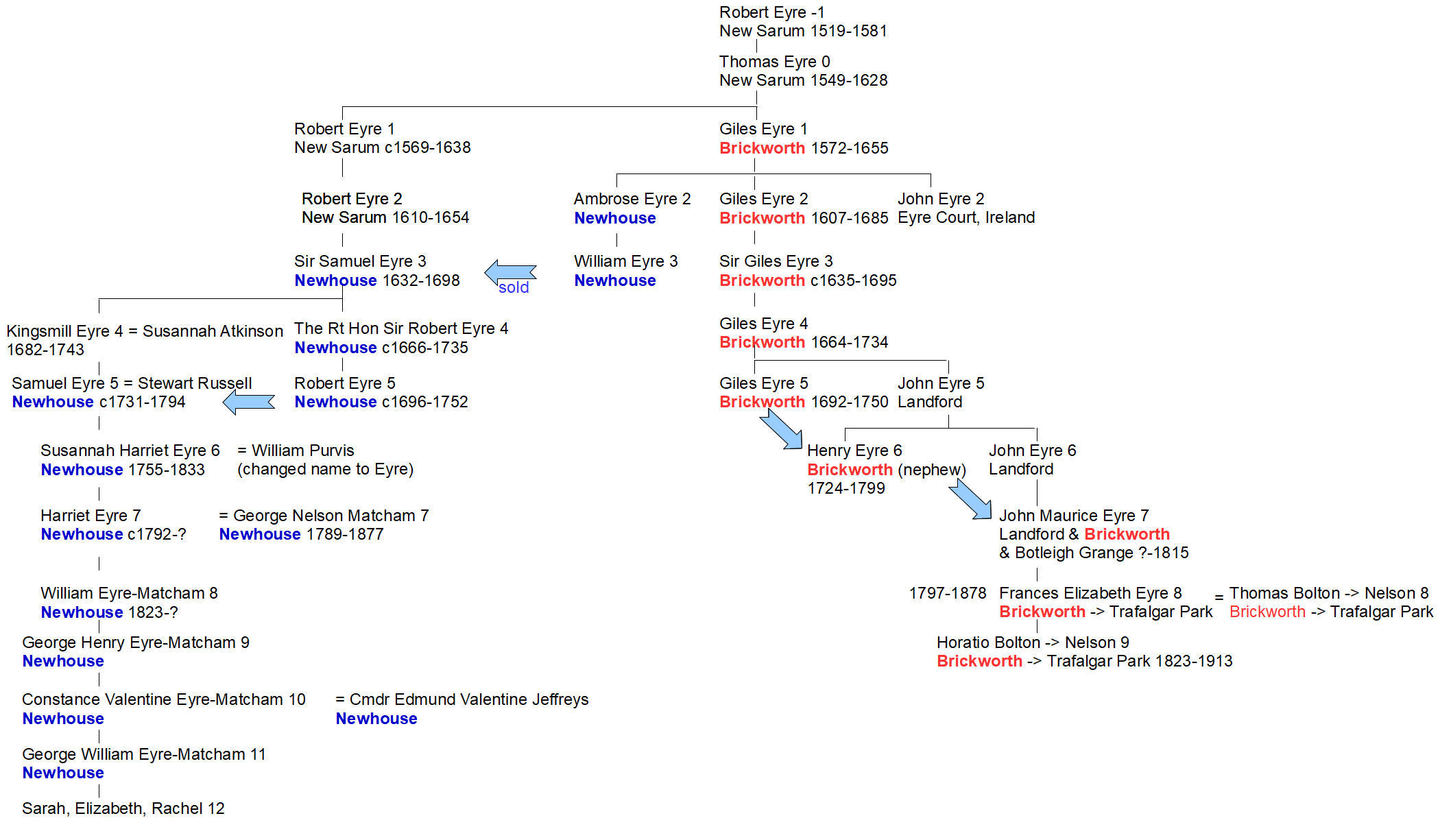 The ownership of Brickworth House started with five successive generations named Giles, this always having been a popular name in the wider Eyre family, still in use today. The ownership listed here is based on Matcham's 1844 account with additional information from Genealogy websites. I've added numbers in brackets to denote successive generations and included Giles Eyre (1)'s father Thomas (0). Family members closely related to Giles Eyre (1) were resident at Newhouse, Landford, New Sarum and Eyre Court in Ireland, and the family moved to Trafalgar House when they inherited the title Earl Nelson in 1835. Brickworth House was rented out after this date and burned down during the lifetime of Frances Elizabeth Eyre (8), its land becoming part of the Trafalgar Estate in 1878 when her son Horatio Nelson (9) (ne Bolton) inherited the Eyre estate on her death. Where the direct line failed and Brickworth passed between branches of the family in the entries below, a clearer view of this inheritance can be seen here.