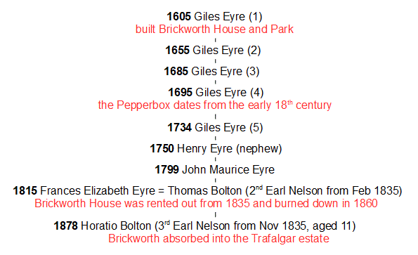 After its establishment in 1605 the Brickworth estate was owned and occupied by the Eyre family until 1835, starting with five successive generations with the same name: Giles Eyre (sometimes spelt Gyles). Having the same name has caused some confusion already in past recording of the history of this estate, so for clarity the generations are identified below by adding the generation number in brackets. From 1835 the house was rented out until it was destroyed by fire in 1860. The Eyre family continued to own the estate, but from 1878, when the dowager Countess Nelson Frances Elizabeth died, Brickworth became part of the larger Nelson estate owned by her son Horatio Nelson (born Horatio Bolton) as third Earl Nelson. Brickworth Park is still there today alongside the A27, one of its lodges standing at the junction with the A36 and the iconic Pepperbox on Pepperbox Hill nearby.