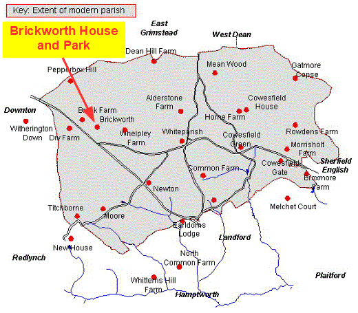 Brickworth House and Park occupy the eastern part of Whelpley Manor, west of the A36 and north of the A27 at their junction. The house is within an earlier hamlet in Whelpley Manor that was known as Breck or Breckore that can be traced from early in the fourteenth century. For this earlier history see Brickworth Hamlet.