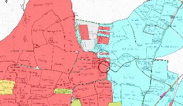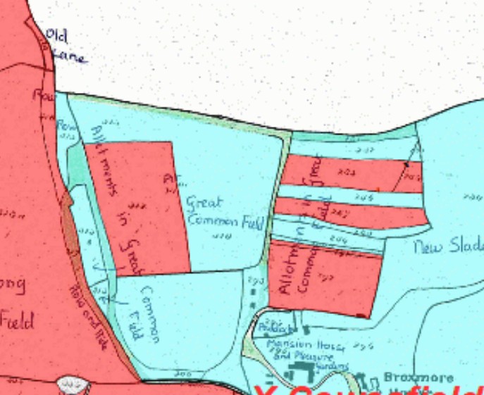 Alderstone and Cowesfield Louveras had earlier been owned by the same person for a time [add details] and when the properties were divided and sold separately the last remaining arable open fields of the two manors in this area were divided between the two manors in alternating blocks as shown in the map below, the original division having presumably been lost.