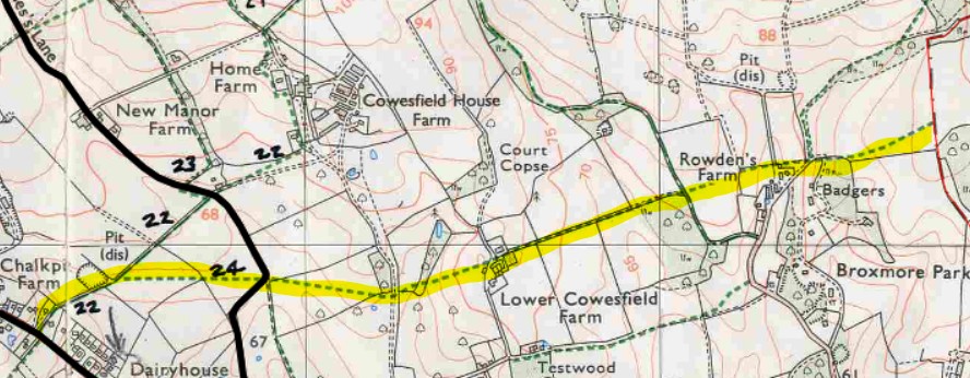 An interesting leftover feature of these last open arable fields is the footpath that runs to them from Romsey Road, passing diagonally across the field behind Meadow Court, providing direct access from the other half of Alderstone around the church, where there had presumably been people still with rights to one or some allocated strips each year when closer ones were enclosed. The footpath passes Lower Cowesfield Farm and Rowden's Farm, reaches and crosses the open fields then stops at the county boundary, and can still be followed today. It stopped on the county boundary in the middle of a wheat field when I visited last in recent years [written 2026]. A second footpath branches from it and passes round the north edge of these fields, following the boundary between the two manors. It then turns towards the northeast across Cowesfield Louveras, crosses Gatmore Copse and on into Hampshire.