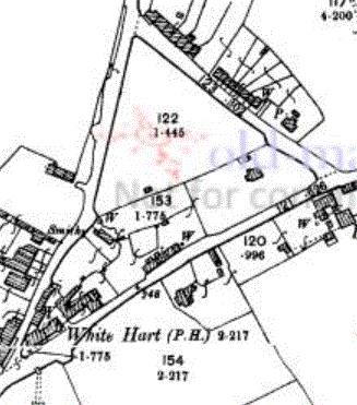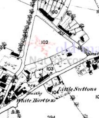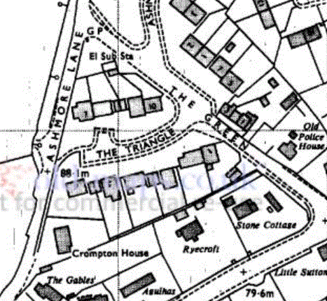 The Green originally occupied a lot more that the outline of The Triangle development, and may have continued southwards to Bunkers Hill, as shown above. The southern edge of the triangular area along Bunkers Hill had houses along it by 1842. There are two old properties remaining - The Gables, a cottage that stands a little back from the road south of Crompton House across the road from The Lynches that was already there by 1842; and The White Hart Public House, now converted into houses. A terraced row of cottages stood on this side of Bunkers Hill opposite Little Suttons (see Bunkers Hill). See The Green for maps and pictures of houses along the road named "The Green".