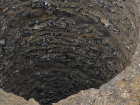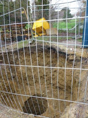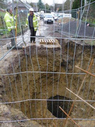 On 21st April 2016 contractors digging a trench across the surgery car park for the new Memorial Hall broke into a well that coincides precisely with the location deduced for the house, and it is almost certain that this was the water supply for the house, either within or immediately behind it. We are fortunate that Peter Claydon was on hand to take photographs before the well was capped, and his pictures are shown below: I am very grateful to him for permission to display them here. Further discussion of this well and its well house can be found on this page.
