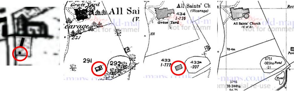 The following sequence of four maps has been used to decide exactly where the house stood. The first of these, Andrews and Drury of 1773, is very much a sketch map, but shows a small building immediately south of the house. This building is shown in Buckler's watercolour, and the accuracy of other buildings on his other views suggests we can take this as a real building. The maps of 1876 and 1925 also have a small building shown that had gone by 1976. Tying up the later maps and the painting has allowed the position of the building to be determined quite precisely, with the well providing further confirmation that the correct site has been selected. It isn't known what this building was, although it is worth being clear that this is further up the hill alongside the pond, and not the site of the well. These maps also show the earlier churchyard boundary, visible in the foreground of the watercolour, and the way the churchyard was extended later across roughly half of the footprint of the house at a date between the 1876 and 1925 maps.