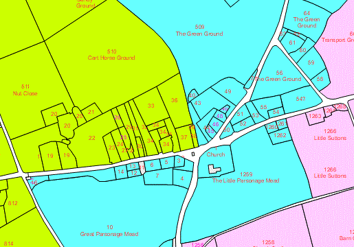 The village centre showing the village green (green) and church and meadows (yellow)