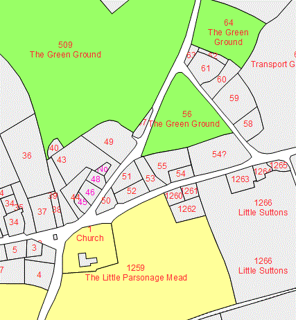 The heart of Alderstone Manor lies around the triangular village green that reaches the church in its southwest corner, includes The Green on its eastern side and also the area that is now occupied by the houses of The Triangle. As seen below on the 1842 Tithe Map, the land occupied by the green extended beyond this triangle itself both westwards and northwards. Houses were grouped along the eastern and southern edges of the triangle, and land to the south of what is now the A27 had been mostly associated with the church and parson in earlier times.