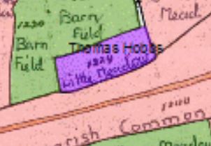 On the 1842 Tithe map parcel 1229, Little Meadow, was owned and occupied by Thomas Hobbs, whereas most of the surrounding land was owned by Countess Nelson and George Yalden Fort and farmed as Common Farm and Golding's and Rowell's Farm, both sections of Blaxwell Manor. This one field is still in separate ownership and is now the site of the BKG haulage business. There is a small house and a large lorry park with its associated buildings. Was this smallholding perhaps a separate assart from the common, or a tithe assignment?