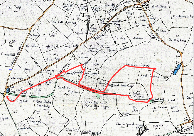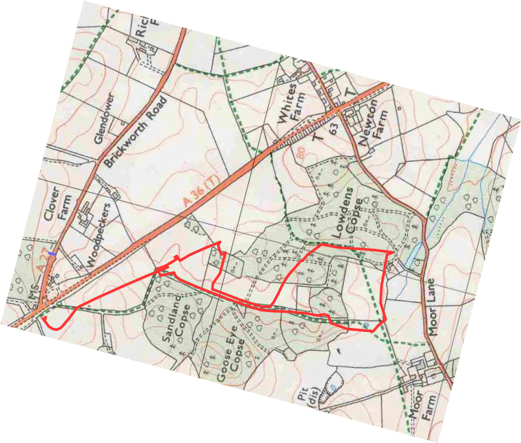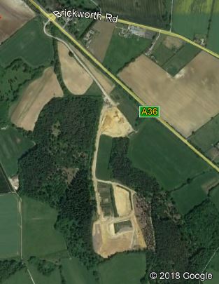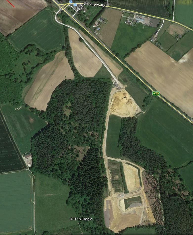 The map below shows the approximate extent of the access road and quarry overlaid on the 1842 Tithe Map. Because the A36 has been realigned at Brickworth and now runs to the south of where "Gile's Eyre's pond" was, the quarry access road appears to start from the middle of nowhere on this map. The section of roadway linking the two quarry areas runs along the 1842 "Green Lane on Sandlands Drove", but other than that the lower (western) boundary, the quarry doesn't generally follow 1842 field boundaries. This lane is still a public footpath and appears to have connected the property of Moore Manor to Brickworth as well as providing access to fields along its route.