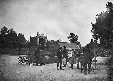 Left: Punch & Judy outside the church between 1903 and 1915 (Vicarage coach house and The Street in the background. The grass triangle can be seen between the stand and the crowd)