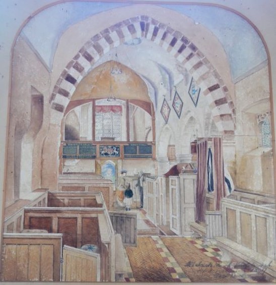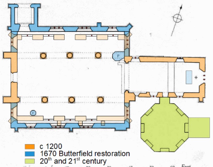 Left: the church as painted by Buckler in 1805 --- Right: the Butterfield 1870 alterations in blue