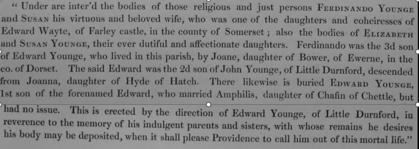 My schoolboy and mediaeval Latin isn't up to this one: I'm hoping to be able to provide a professional translation through the granddaughter of a Whiteparish resident, a classics teacher. Of course, if you can provide me a translation of this or any of the other Latin memorials, I would be very pleased.