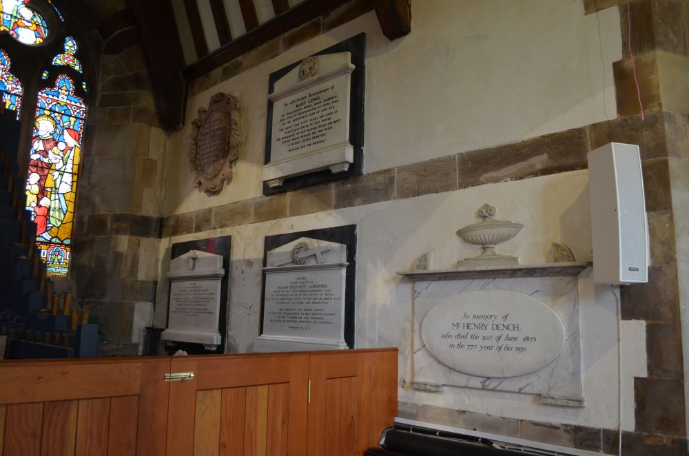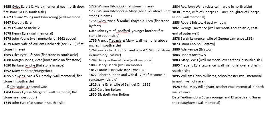 The monuments inside the church described here represent a tiny proportion of people who died between 1655 and 1928, most of them were prominent members of the local landed gentry.