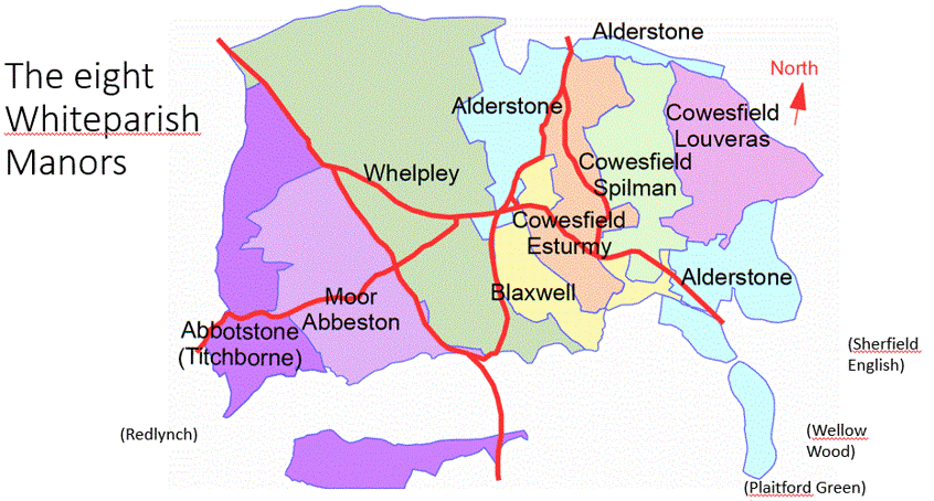 Left: the eight Whiteparish manors --- Right: the three Cowesfield manors, enlarged