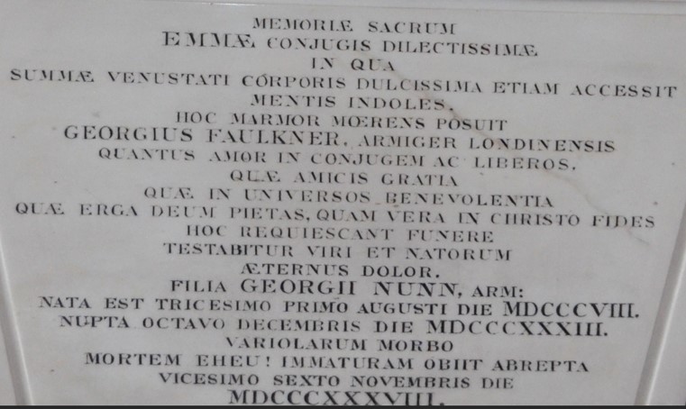 Emma Faulkner d.1838 wife of George Faulkner, daughter of George Nunn (wall memorial) 500