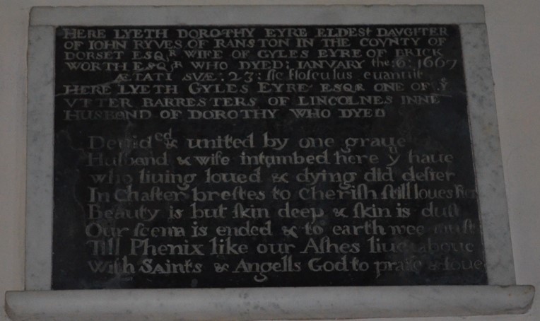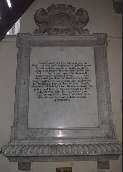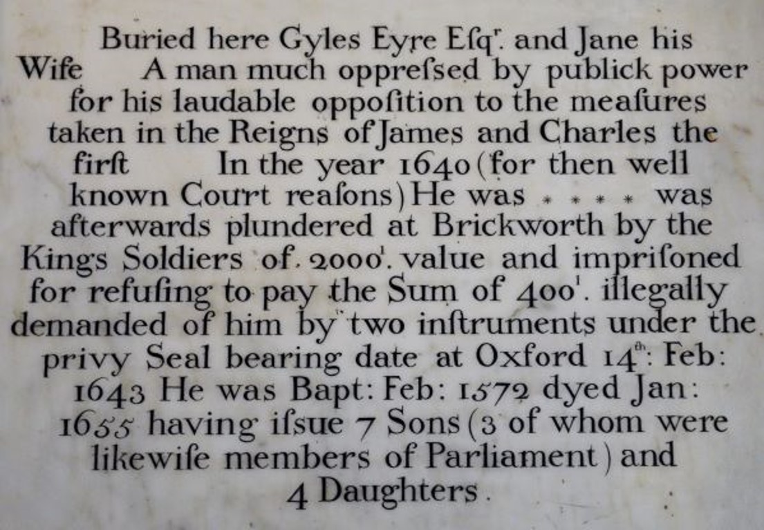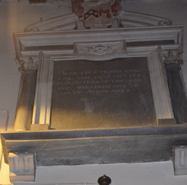 Sir Gyles Eyre 3 d.1695 & Dorothy (wall memorial, flat stone in south aisle not visible) 543