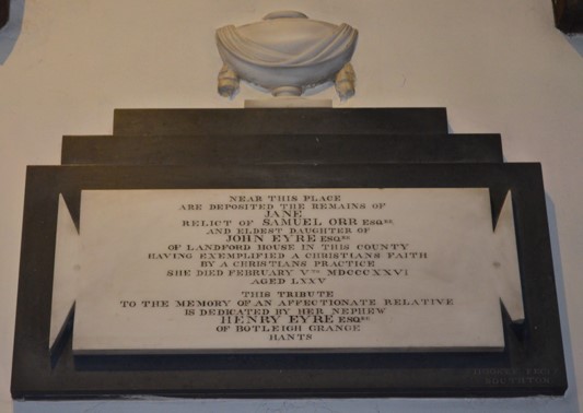 Jane Eyre d.1826 (wife of Samuel Orr 1812, wall memorial) middle of south aisle wall 535, 536