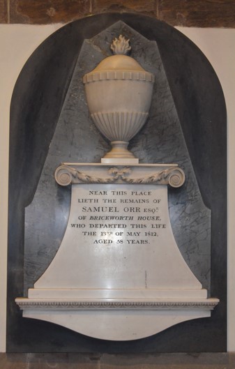 Samuel Orr d.1812 (see wife Jane Eyre 1826) (wall memorial) middle of south aisle wall 535, 536