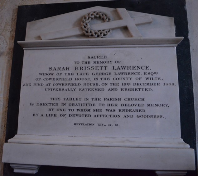 Sarah Lawrence d.1868 wife of George Lawrence 1861 (wall memorial) south aisle, east end of outer wall 528