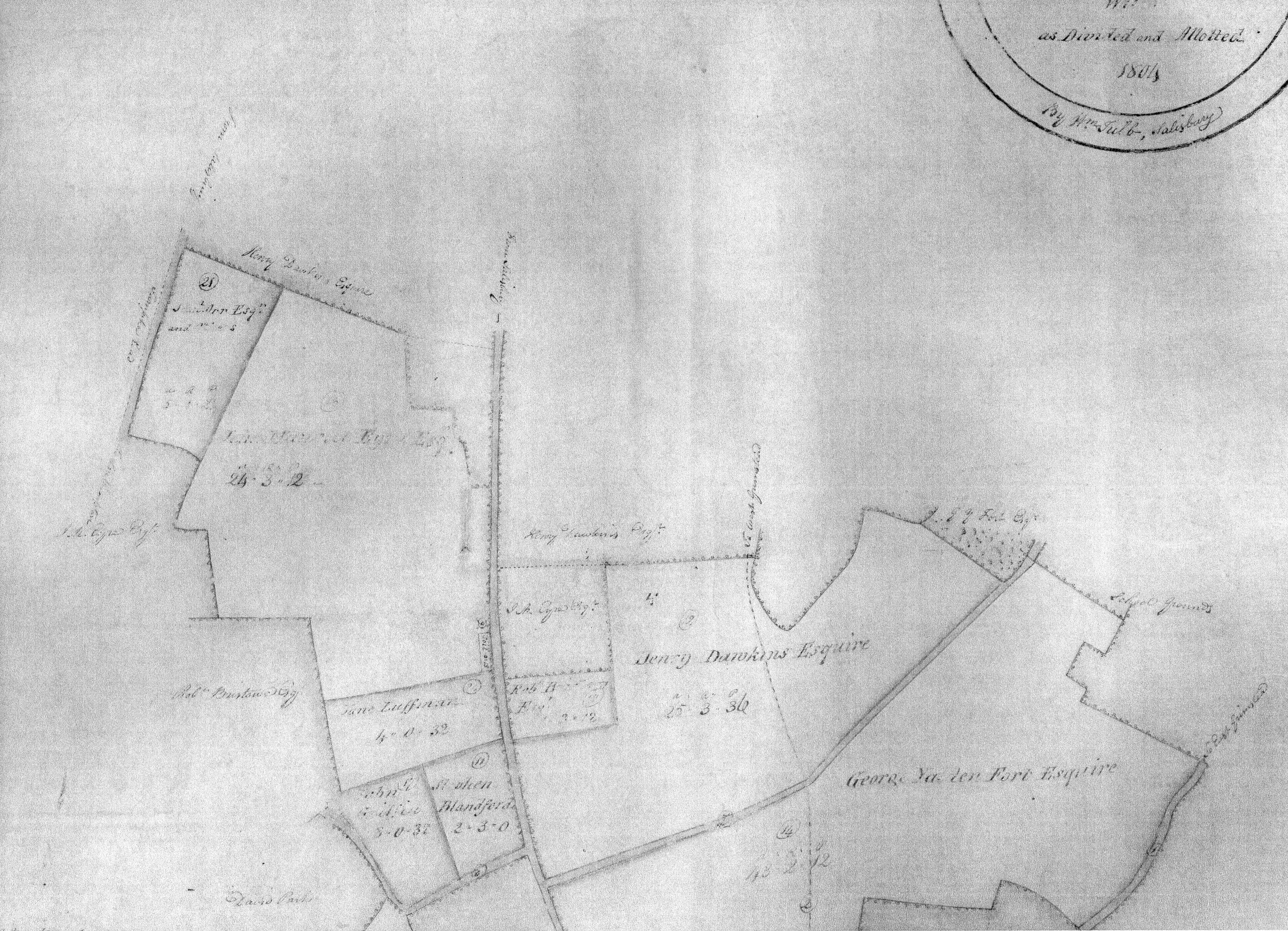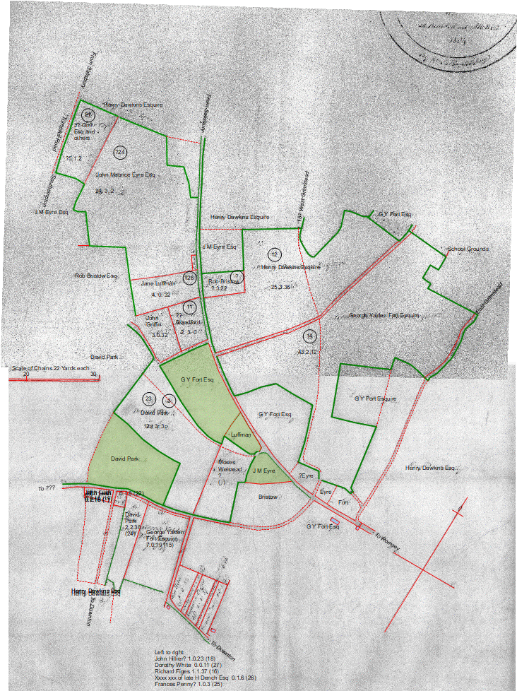 The 1804 Whelpley Enclosure Award is a map showing the land allocations made when the remaining parts of the four Whelpley commonable arable fields (Royal field, Tipple or Triple field, Elm or Ellen field and Southern field) were enclosed. It also shows ownership of adjacent land already enclosed and gives an insight into how the new land allocations gave existing landowners contiguous areas of land where possible. On the copy of the map below, the green traced boundary shows the edges of the allocation: names outside this line are the owners of adjacent areas prior to the allocation, names within it are the new allocations.