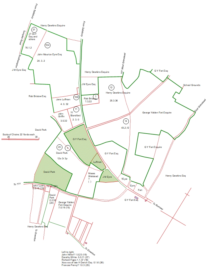 I have prepared several versions of this map from these photocopies, all available via the links below, including a direct copy, Phoebe's inked version and a set of individual copies coloured to show landowners, occupiers, roads & paths, commons, land use (incomplete), manors & tithings. Phoebe's inked version is the uncoloured tracing version below, which can also be viewed on the village website at Whiteparish.co.uk. That website also provides comprehensive database access to the list of apportionments for the Tithe map and to the 1842 Census, also now available online. Thanks to Dave Hawker for permission to display his scan of Phoebe's map here and to use it as the base map for the coloured versions.