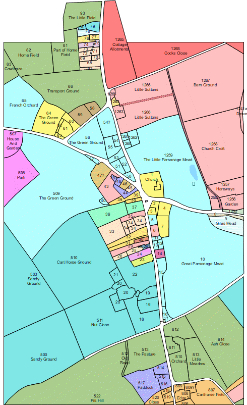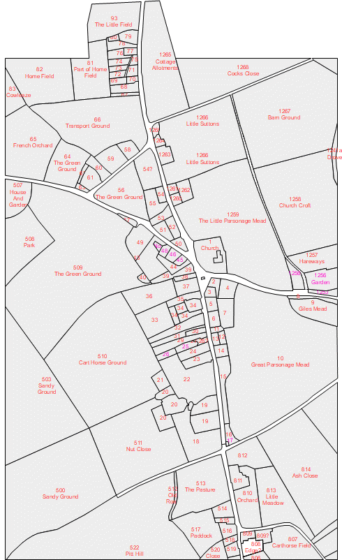 Detailed discussion of all aspects of this map can be found widely spread across this website on the pages describing the manors, farms, estates and settlements in the parish. Use the contents list to the left or full alphabetic index to reach pages of interest.
