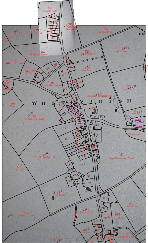The maps on this website that still use the original copies correct an increasing number of identified copying errors of field boundaries, parcel numbers and names, although given the very large number of land parcels it is very probable that some remain and even that new mistakes may have been made. I am indebted to David Hawker for his kind permission to use his scanned map tiles of Phoebe's map as a background to the maps here while I prepare more detailed ones that faithfully reproduce the open and enclosed field boundaries on the original map and incorporate all the corrections I have found to date. In the meantime, many of these corrections are progressively appearing on the coloured maps showing landowners, occupiers, and manors and tithings viewable using the links below.