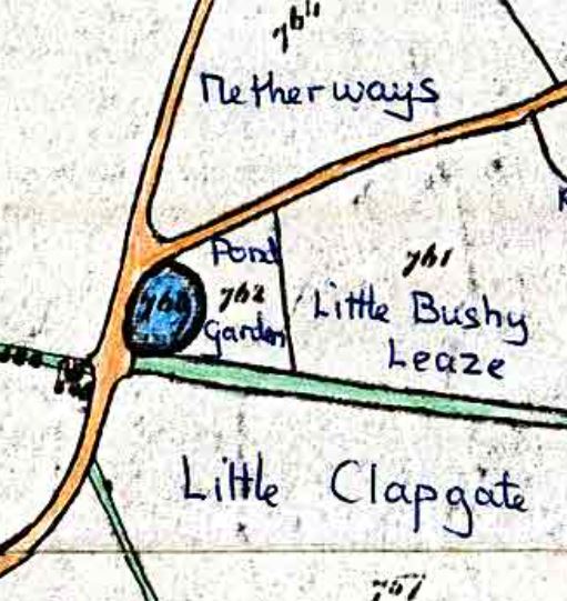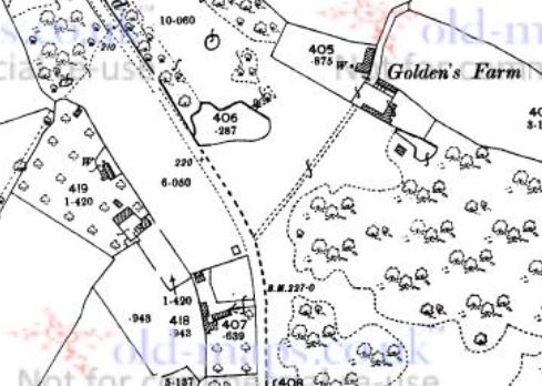 There is also a pond opposite and north of Poundside Cottage to the east of Common Road and also north of the Golden's Farm entrance. This was pointed out to me by by Brian Snelgar (30.4.2018) and is shown on maps up to 1962, not being present on the 1966 OS map. This pond is very much still there, but has been overgrown by tangled woodland [add my modern photograph of the spot].