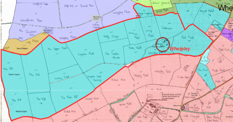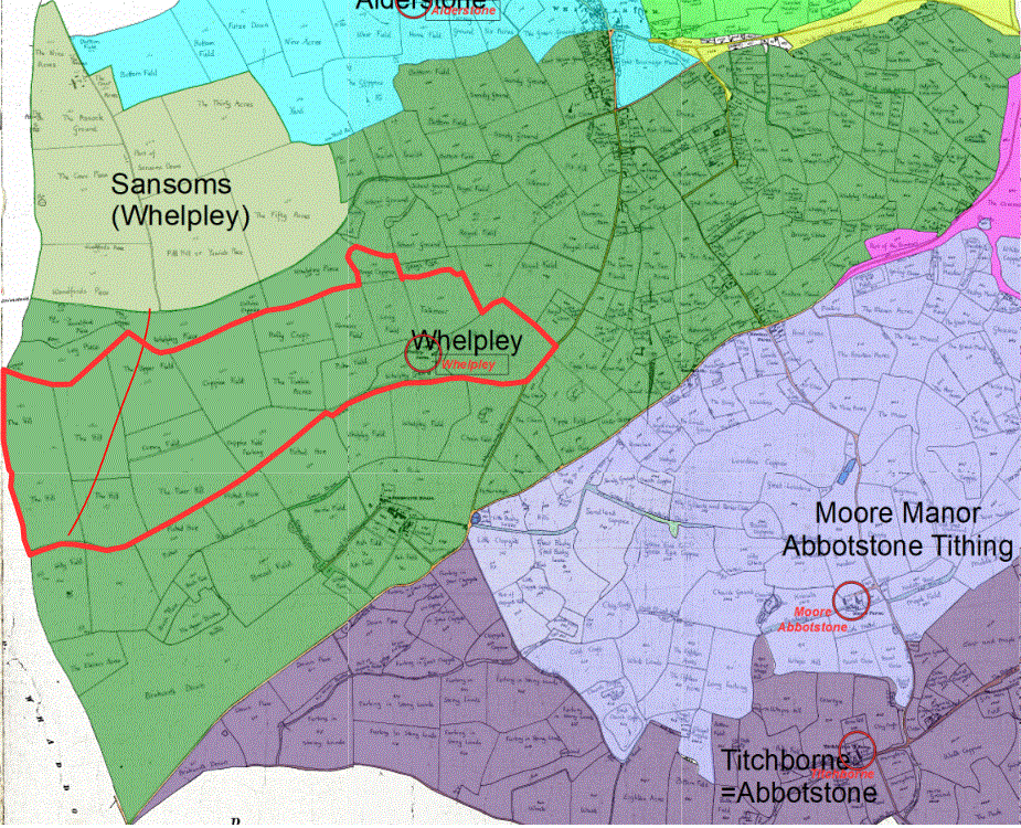 The extent of Whelpley Farm in 1842, showing owners on the left and manors on the right (north to the left)