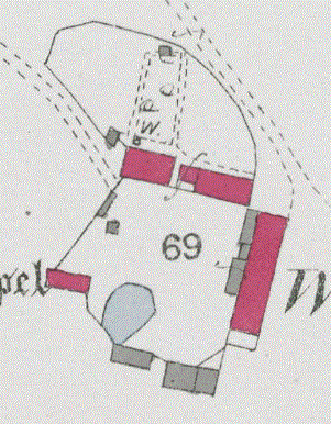 On the right hand map the chapel is the northmost building of the left (west) side of the track in the farmyard, not the building indicated